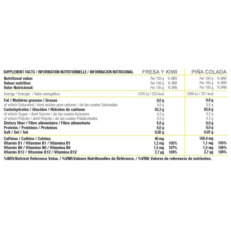 Cada gel incluye 30 mg de cafeína (fresa-kiwi) o bien 120 mg de cafeína (piña colada), un plus ergogénico que mejora el estado de alerta y la percepción del esfuerzo. Los sabores son agradables y pensados para una buena tolerancia en esfuerzos prolongados.