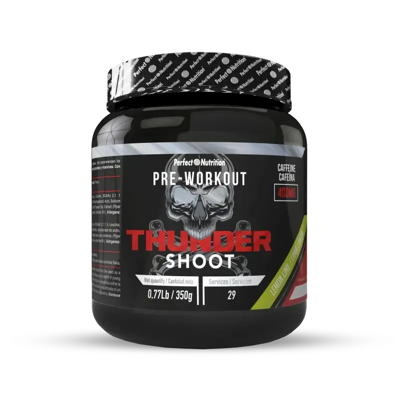 Thunder Shoot (350 gr) es un pre-entrenamiento formulado para quienes buscan el máximo rendimiento desde la primera repetición. Su mezcla de beta-alanina, citrulina malato, creatina, cafeína y aminoácidos ofrece un impulso inmediato de energía, mejora el flujo sanguíneo y retrasa la fatiga muscular.