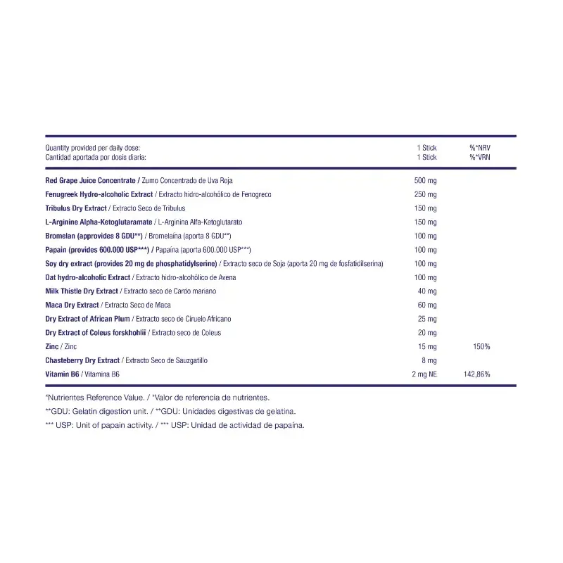 20 sticks con extractos vegetales, aminoácidos y micronutrientes para apoyar el rendimiento y el equilibrio hormonal.