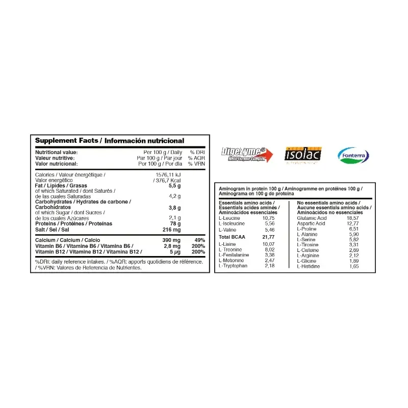 Caseína micelar y caseinato cálcico. Mantiene un aporte constante de aminoácidos durante horas para favorecer la recuperación muscular.